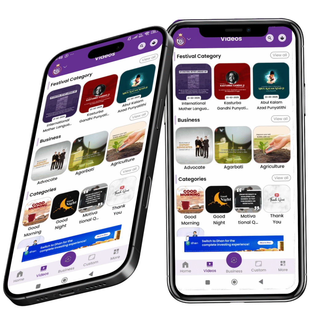 You can easily market and grow your business during all festivals (Diwali, Holi, Eid, Christmas, Ganesh Chaturthi, etc.) by using a huge collection of ready-made creative templates (posters, videos, stories, banners, etc.). Instead of designing from scratch, just pick a template, customize it, and share it instantly to promote your brand.